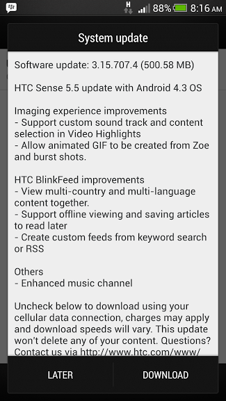 هذا الاعلان الذي ينص على تحديث هاتف HTC المسمى Butterfly حيث أن التحديث يحتوي على العديد من المميزات منها التحديث لواجهة Sense وايضا الكثير مثل تحديث وتحسين للراديو وأيضا تحسين الكاميرا بشكل عام والصورة السابقة تقول الباقي حيث أن التحديث يبلغ 500 ميغابايت ولا يمكنك تنزيله الا عبر الهواء .